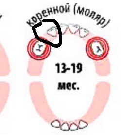 У нас этот зуб (черным обвела) уже 2 месяца почти лезет и вот вылез на половину и сидит. Норм? Или надо беспокоиться что он застрял?