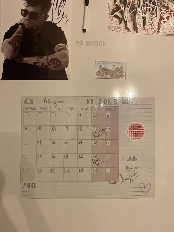 Хочу поделиться кое-чем забавным: у нас магнитный календарь с маркером, и я его не обновляла с августа — с момента, когда о беременности узнала. Добавились только записи про переезд и поход к врачу (узи до постановки на учёт), а вот даты зависли, так как тогда токсикоз начался😁