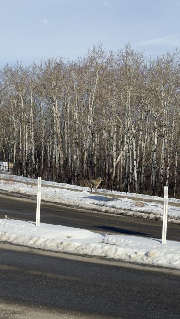 Забрали Мари со школы, шли через лес, уже подходим к дому, на пешеходном поворачиваюсь, а за нами койот шел😁