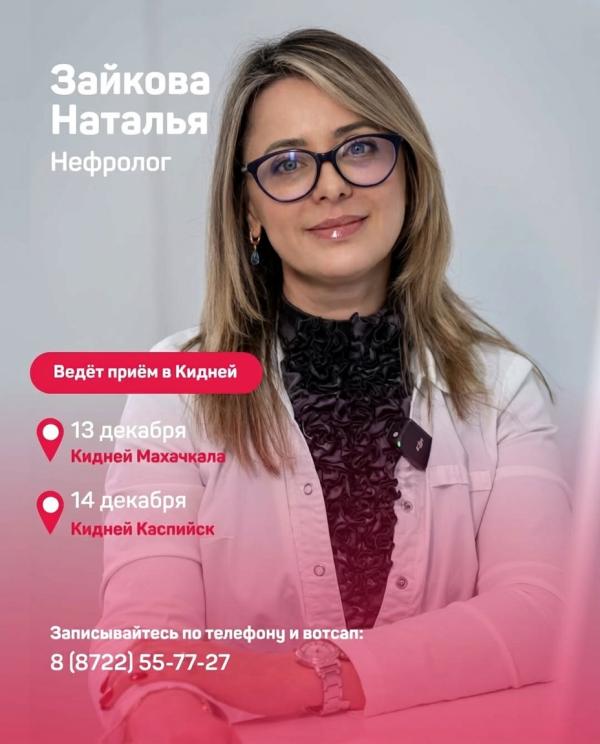 13 декабря в Махачкале и 14 декабря в Каспийске вас примет Зайкова Наталья Михайловна — профессор, заведующая учебной части кафедры инновационной педиатрии, хирургии РНИМУ им. Пирогова, доктор медицинских наук, нефролог отделения врожденной и приобретенной патологии почек НИКИ педиатрии им Ю.Е. Вельтищева.