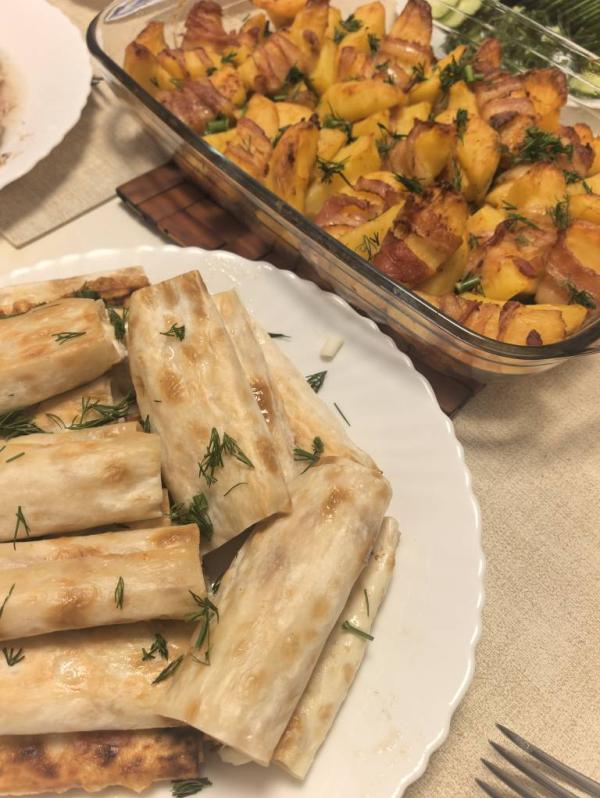 А на фото накрутила мини рулетики из лаваша и начинку завернула (яйцо, колбаска, сыр и сметана/мазик, соль). Потом все обжарить быстренько с двух сторон. Съели все за 5 минут😍