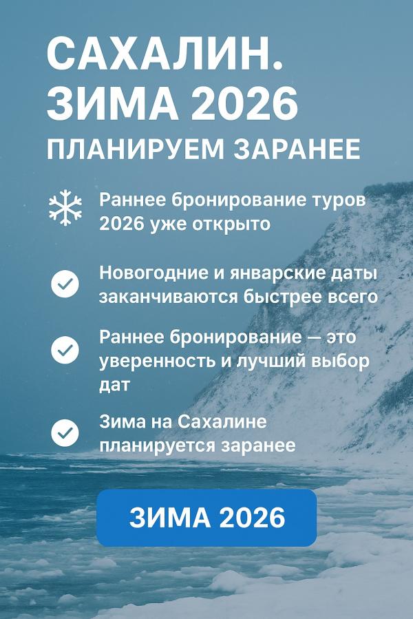 ✨ Бронирование туров 2026 уже открыто Почему сейчас: ▪️ Новогодние и январские даты заканчиваются быстрее всего ▪️ Раннее бронирование — это уверенность и лучший выбор дат ▪️ Зима на Сахалине планируется заранее https://t.me/sakh_gid_tour/854