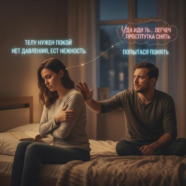 И в такие моменты особенно больно, когда вместо попытки понять ты сталкиваешься с раздражением и грубостью. Когда в ответ на «мне сейчас не хочется» ты слышишь что-то вроде: «да иди ты… легче проститутку снять». Эти слова не про секс. Они про обесценивание. Про ощущение, что тебя в этот момент не видят человеком, а только функцией.
