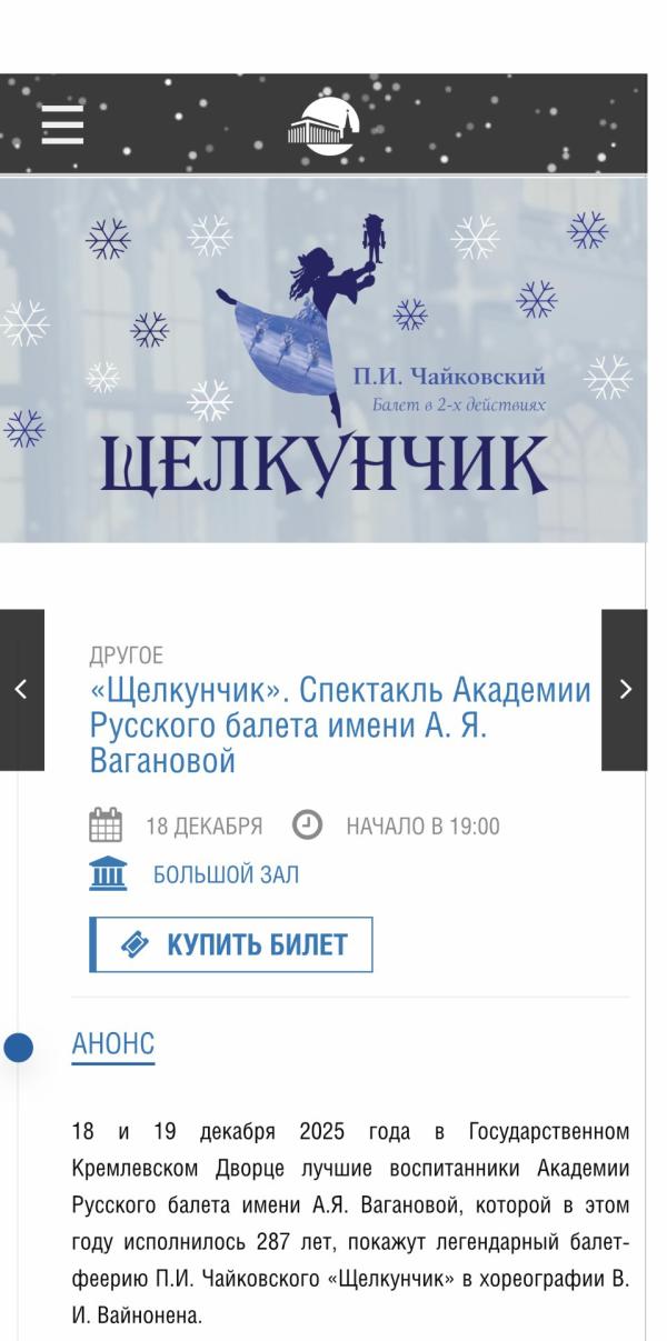 Кто тоже хочет попасть на Щелкунчика, берите в Кремль на 18/19 декабря. Это именно он, Мариинский.