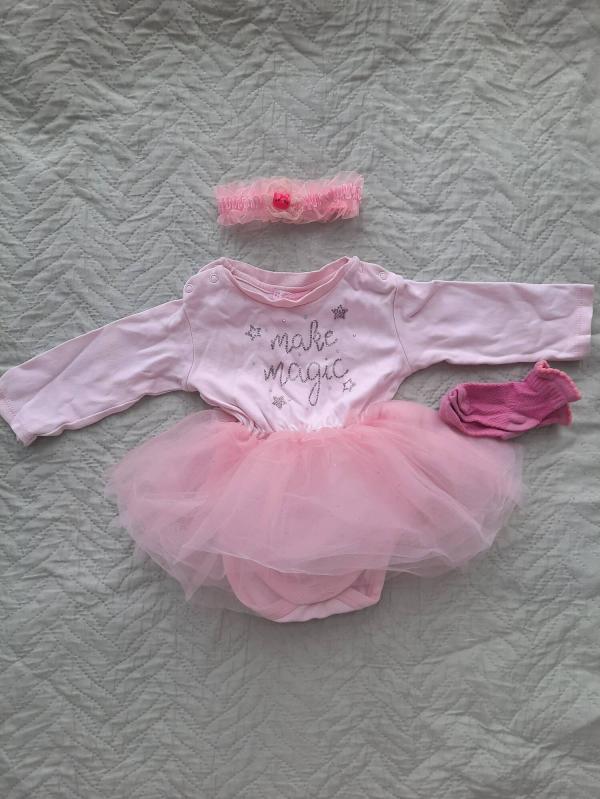 Нарядное платье боди для маленькой принцессы. Ростовка 74см. Юбка состоит из 5 слоев. Повязка и носочки в подарок. На попе есть маленькое пятнышко (фото 2). Из под не видно. Цена 270р. Забирать Аникина 35, АвитоДоставка