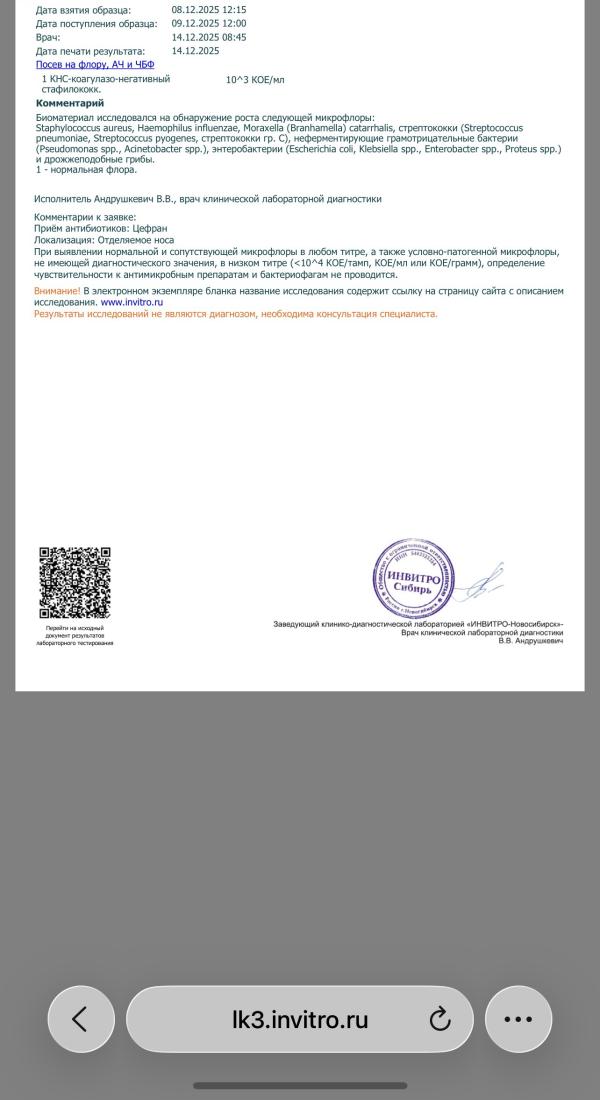 Катя, это из носа мазок сдавали? У младшего сдавали титр был 10*6 назначали антибиотик.