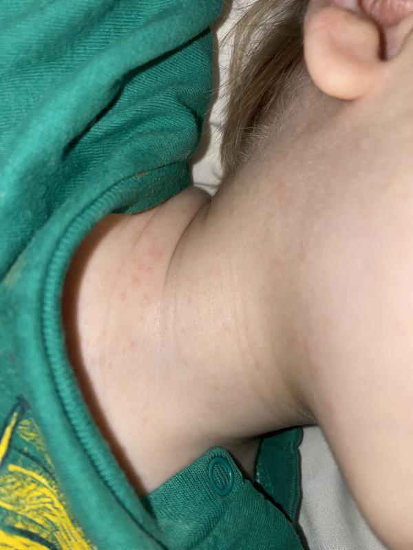 Девчонки, сына окидало. Щёки, шея и чуть ниже. Прыщики ярче, чем на фото. На что похоже? Аллергия? Что-то я растерялась. Педиатру написала