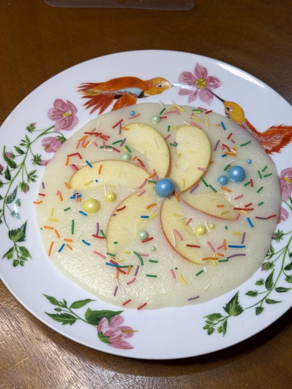 Утром сварила девчонкам манную кашу, украсила яблоком/кондитерской посыпкой 🌈