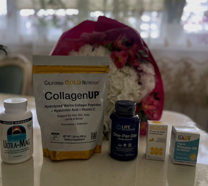 Собрала вот такой подарок невестке, которая недавно родила❤️🩹 Маме: магний, коллаген, мультивитамины. Малышке: биогая, д3.