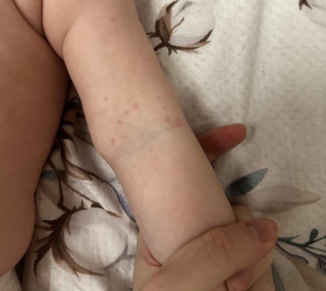 Новые продукты не вводили , позавчера был контакт с собакой , вчера немного может быть вспотели, пошла вот такая сыть, чуть на пузике , на складках руках , и на одной ноге штуки 3, чуть на голове .