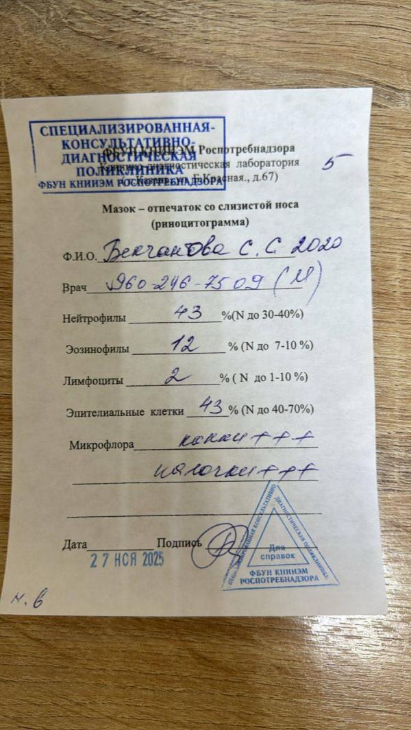 Результат указывает на наличие аллергического воспалительного процесса (аллергический ринит). Признаков острой бактериальной инфекции не выявлено.