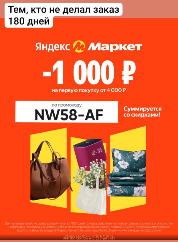 Яндекс маркет наконец-то промокод выдал Переходите по ссылке: https://gtblg.ru/SkK3ix?erid=2SDnjeTVKBV Используйте промокод: NW58-AF — 1000₽ на первый заказ от 4000₽ (для тех, кто не совершал покупки 180+ дней) Торопитесь! Акция может завершиться досрочно