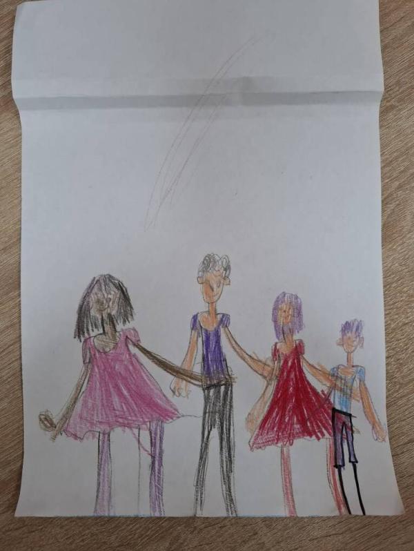 Мне показалось, будто девочка считает, что мама любит брата больше так как нарисовала её рядом с ним держащим за руку