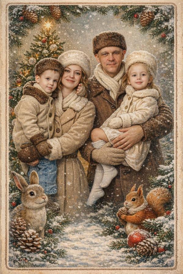Сделай из этой фотографии старую открытку в стиле «Новый год». Добавь елочку, зверушек, еловые шишки. Стиль- советские сказки. Формат - 9:16. Одежду измени на зимнюю старую одежду, добавь меховые советские шапки: - у парня шапка из ондатры - у девушки из норки. Лица остаются максимально похожими, как на исходном фото