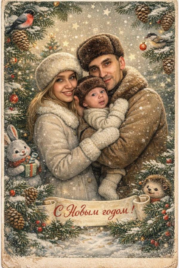 Сделай из этой фотографии старую открытку в стиле «Новый год». Добавь елочку, зверушек, еловые шишки. Стиль- советские сказки. Формат - 9:16. Одежду измени на зимнюю старую одежду, добавь меховые советские шапки: - у парня шапка из ондатры - у девушки из норки. Лица остаются максимально похожими, как на исходном фото.