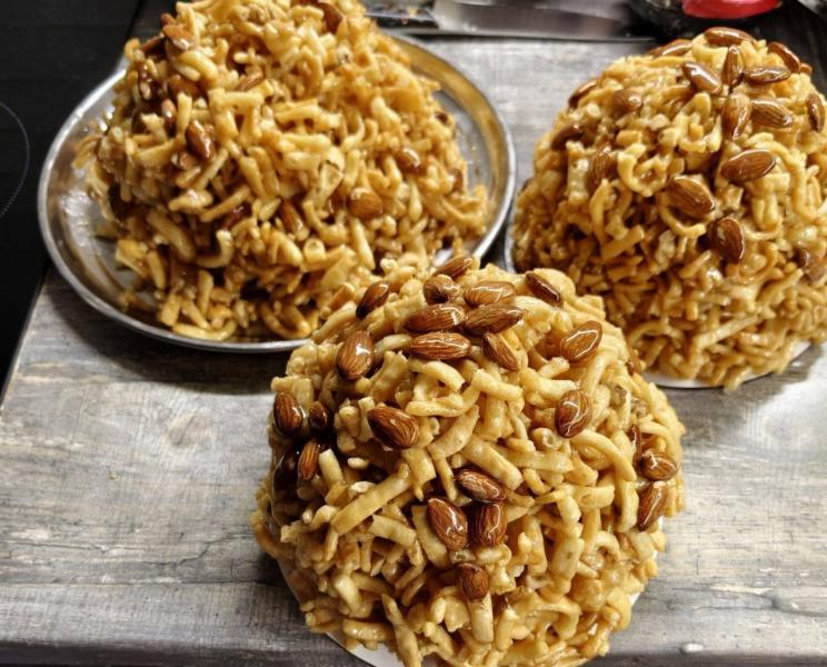 Залить хворост и перемешать аккуратно лопаточкой, выложить в тарелочку, поднос