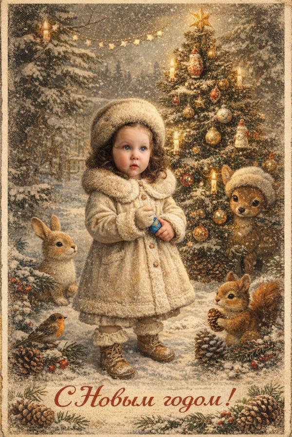 сделай из этой фотографии, старую открытку в стиле Новый год, добавь елочку , зверюшек, еловые шишки Стиль советские сказки формат 9:16 одежду измени на зимнюю старую одежду, добавь меховые советские шапки у всех шапка из норки лица остаются максимально похожими как на исходном фото