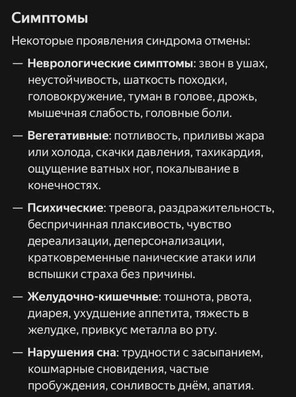 Я без отмены препаратов чувствовала все абсолютно перечисленные симптомы на протяжении пол года остро и потом полегче было