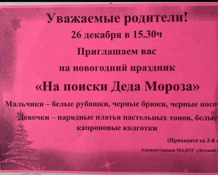 В садике на все праздники у нас форма - белые рубашки, черные штаны, черные носки. Абсолютно на все. В этом году даже на Новый год вот прислали приглашение.