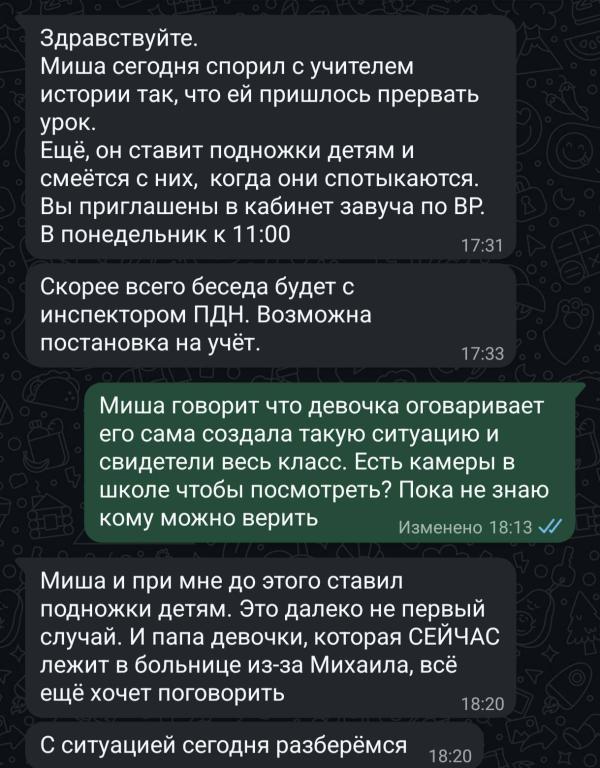 @olgalevina589 в школе учится нормально, две тройки, русский стабильно и в этой четверти историю упустил.. жалоб нет, но последнее время дома треш творится, не хочет ничего делать, говорит устает, но опять же пока на работе сидит в телефоне, меня критикует, иногда эгоцентризм стал зашкаливать,короче подростковый возраст в полном разгаре.. у нас еще классная постоянно угрожает учётом в пдн,чуть ли не свершившимся фактом, и сегодняшние сообщения опять я восприняла как угрозу с ее стороны.. у меня сын не уголовник и не драчун, не злобный, с учителями корректно ведёт себя, а ей мне кажется так и хочется его на учёт отправить..