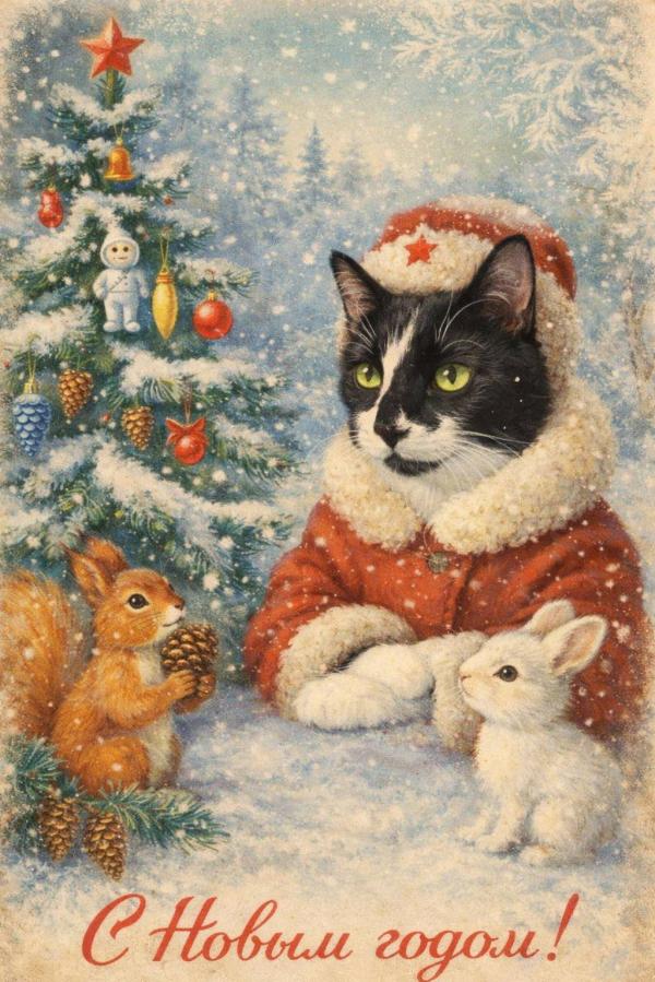 Создай винтажную новогоднюю открытку на основе загруженной фотографии.