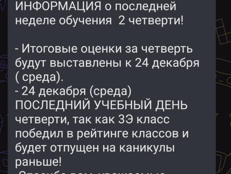 Урааааа, класс Матвея опять выиграл в рейтинге и уходят они на каникулы на два дня раньше🥳💃