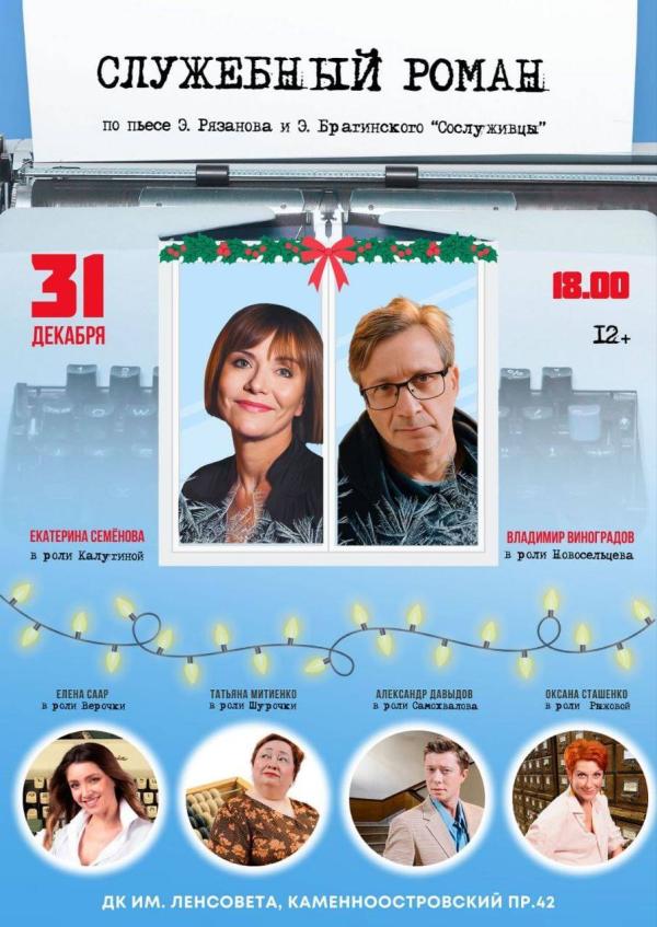 ДК ЛЕНСОВЕТА Предложение на Новый год. *СЛУЖЕБНЫЙ РОМАН* 31.12, 18.00 🎟️партер с 5 по 10 ряд - 2500 руб, 🎟️Партер с 13 ряда - 2000 руб, 🎟️ амфитеатр с 4 ряда - 1700 руб, 🎟️ бельэтаж (середина) - 1500 руб. Электронные билеты