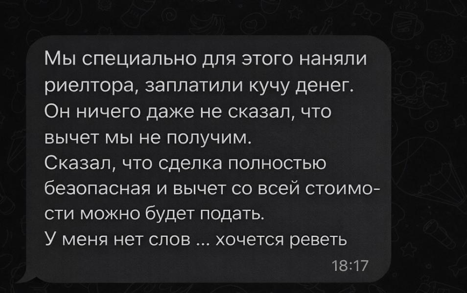 Риелтор уверил , что с миллиона по договору семья получит вычет, а именно 130 тыс.