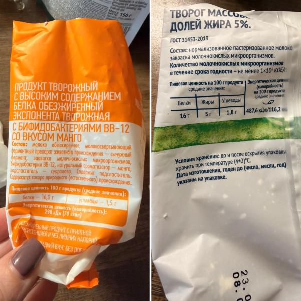 Ну , каммон , ребята 😁в обычном твороге абсолютно такое же содержание белка! Да, чуть больше калорий (не существенно) и 5 гр жира (у меня постоянный недобор жира, поэтому на это даже не смотрю).