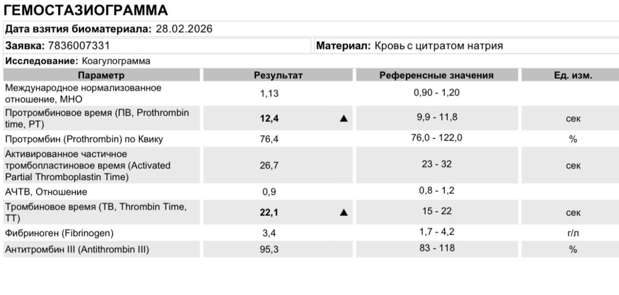 • Антитромбин III (95,3%): В норме. Это естественный «тормоз» свертывания, защищающий от лишних тромбов.