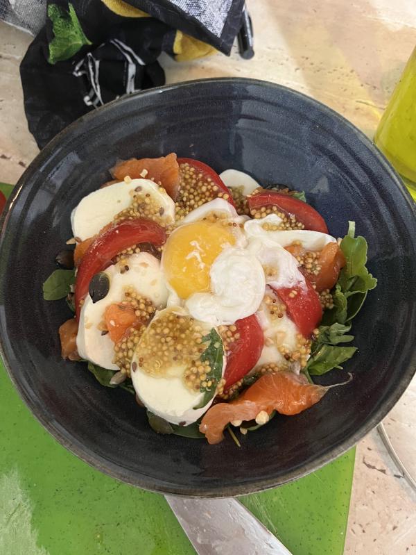 Берём шпинат или микс салатов,слабосоленую рыбу,помидоры,смесь для салата из Орехов и семечек,яйцо,сыр любой (у меня моцарелла).Для заправки масло взбиваем вилкой,немного горчицы с зернами,лимонный сок,соевый соус. Думаю,что все знают как делать яйцо пашот. Все выкладываем,поливаем соусом и наслаждаемся.